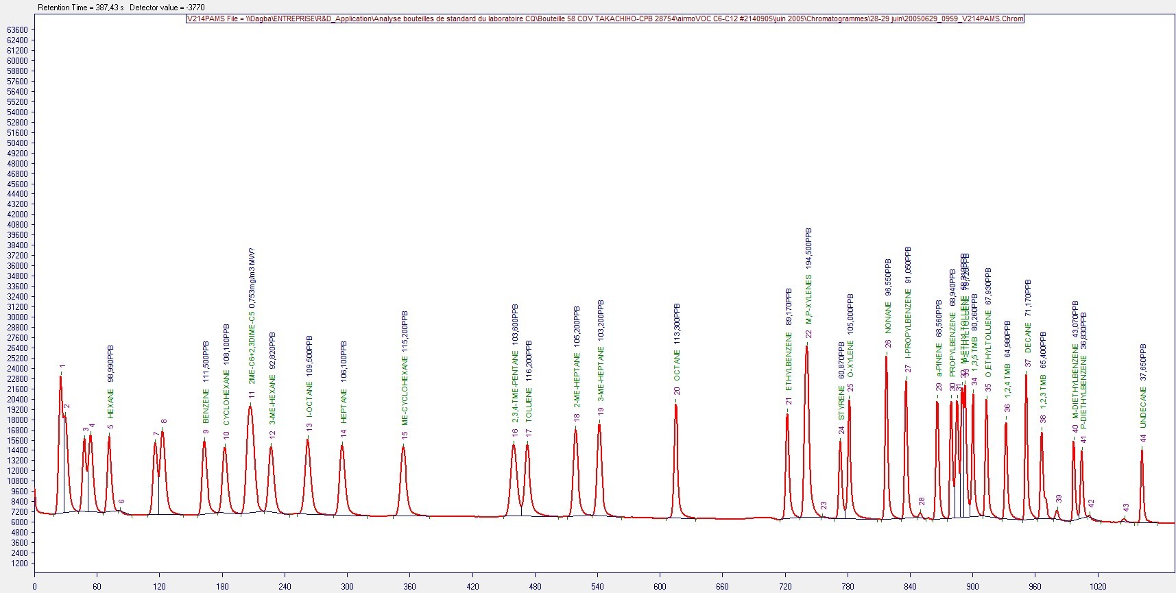 クロマトグラム:PAMS 56成分などの多成分VOCの一斉分析データ