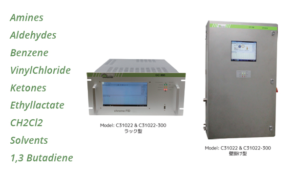 | 測定対象ガス | アプリケーションに応じたVOC: BTEX、塩素系溶剤(ジクロロメタン、1,2-ジクロロエタン) 塩化ビニル アルデヒド類 C1〜C6、C6〜C12(chroma FID-300ではC6〜C40) MEG/TEG、ベンゼン(3分 ※chroma FID-300を除く) アミン類 |