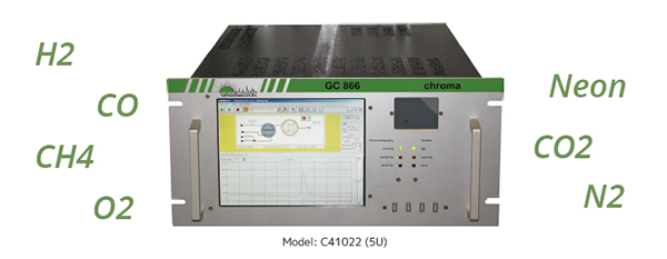 chroma TCDは、熱伝導率検出器(TCD)を採用し、Ne, H2, CO, N2, O2, CH4などの永久ガスやCO2をppmから%の広い濃度範囲で定量・監視する自動アナライザーです。